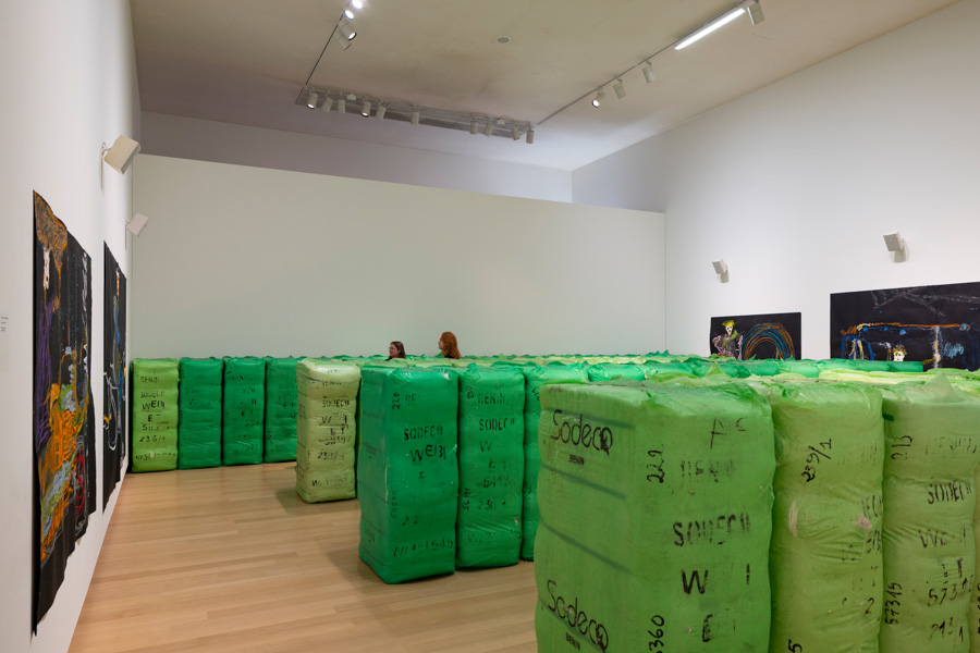 To symbolically visualise the triangular trade between Africa, the US, and Europe, the artist had several dozen bales of cotton shipped to the Netherlands, which now form the heart of the installation. On one of the side walls, Oussou displays documents that reveal the extensive bureaucracy governing this shipment.
