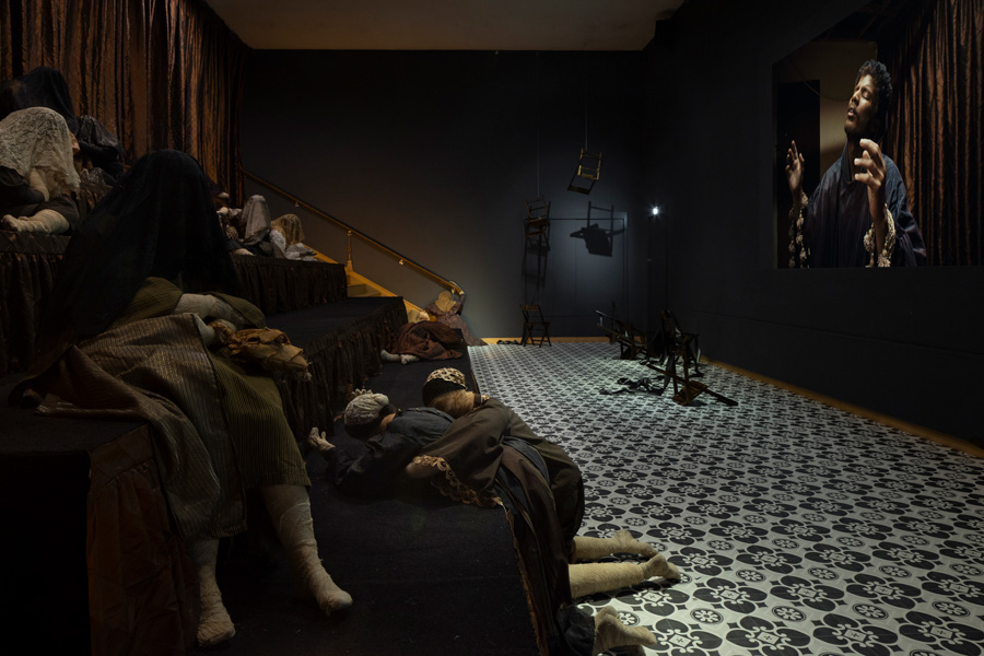 The slowly disappearing ritual of Ocho Dia, an eight-day mourning period following a funeral on his native island of Curaçao, is the starting point for the installation that Osepa created for the Prix de Rome. A museum corridor is transformed into a living room, complete with black-and-white tiled floors, a fan, washbasins mounted on a blue wall, and laundry hanging to dry. At the end of the corridor, we enter an auditorium where dolls lie scattered across the floor. Are they relatives, mourners, or the deceased? We watch a film that evokes Ocho Dia. The work is a powerful, highly evocative whole, an ode to life.