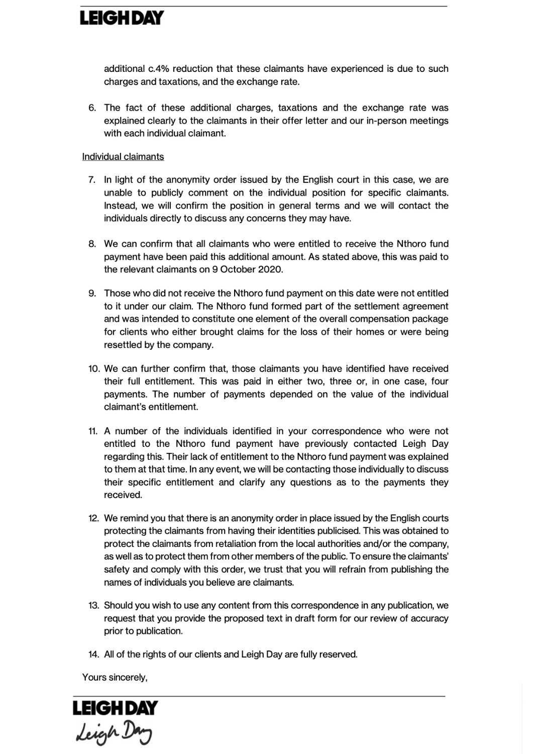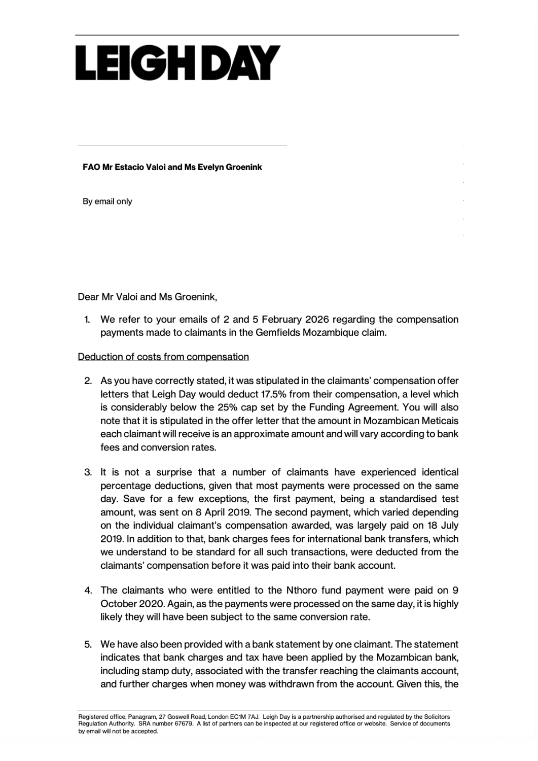 Response Leigh Day to ZAM's submission containing Montepuez beneficiaries' complaints