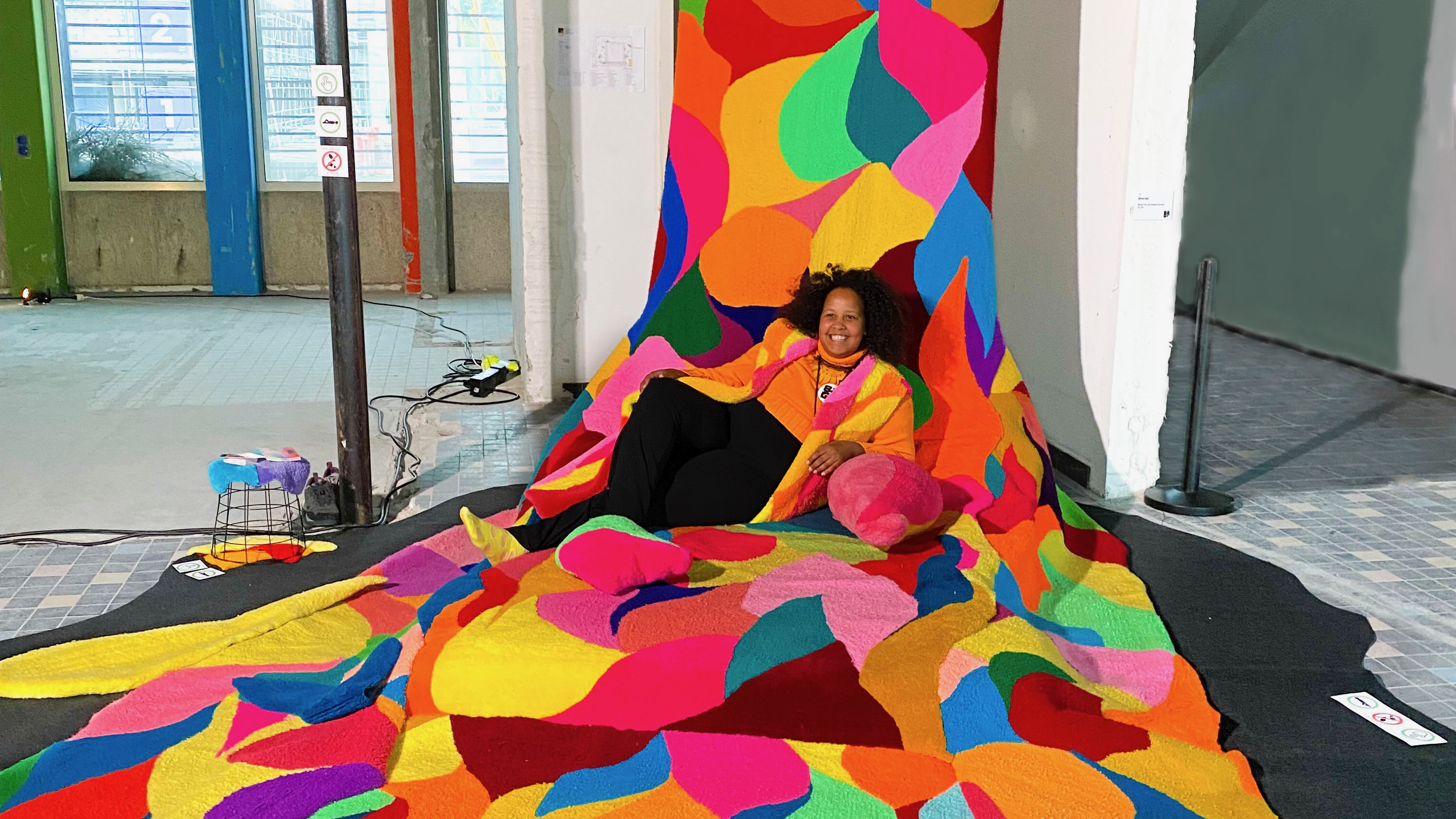 You are not just allowed, you have to(!) sit, lie or hang on the Harmony of Love by Marian Genet. Her colourful artwork invites you to meet, connect, reflect, and touch.Take off your shoes, take a seat & meet!